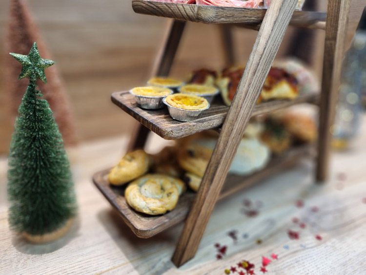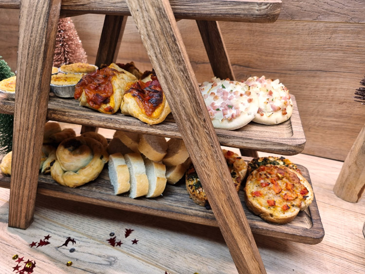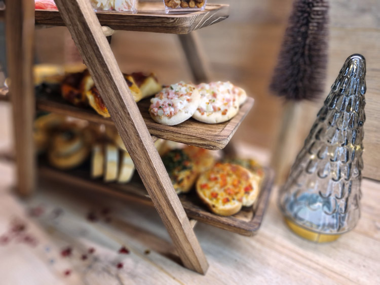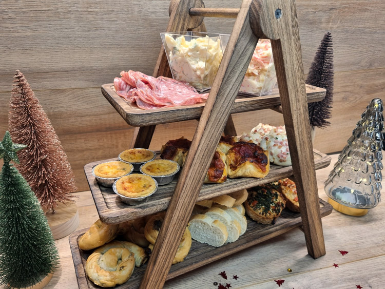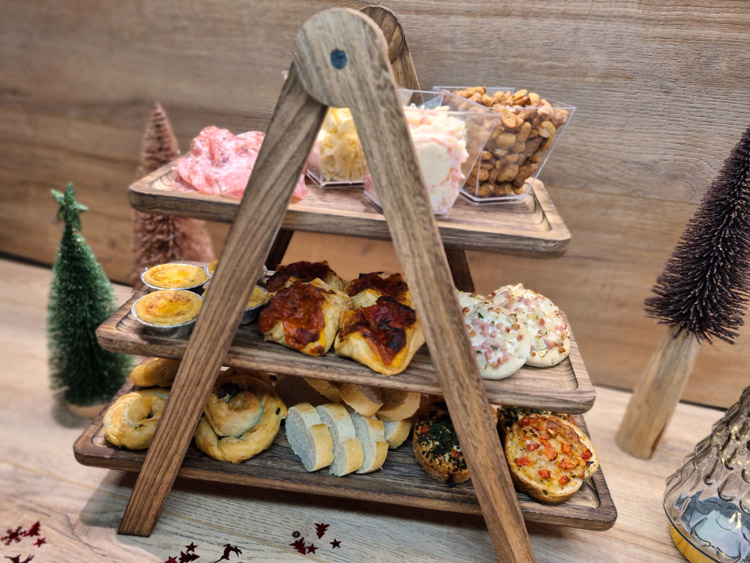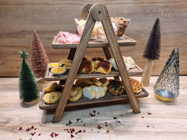 Een goed gevulde etagère om heerlijk van te genieten. Bijvoorbeeld bij de borrel of als aanvulling op je kerstbrunch. Sommige items moeten thuis nog even in de oven afgebakken worden. Bevat +/- 40 stuks. Geschikt voor 4-8 personen.