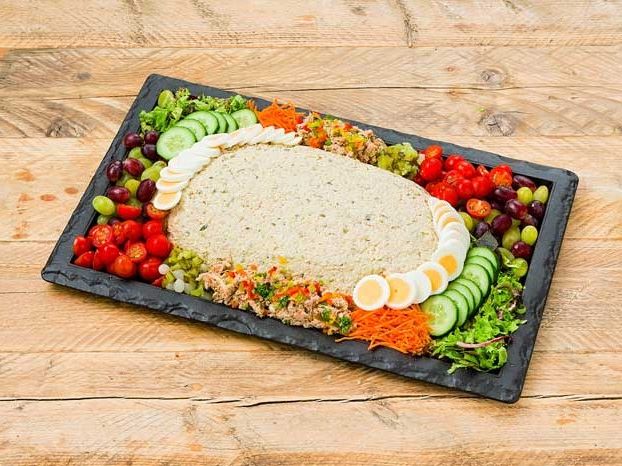 250 gram koude schotel per persoon. Gegarneerd met sla, fruit, rauwkost en ei. (gluten, ei, soja, selderij, mosterd)